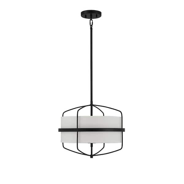 16.25 in. W x 13.75 in. H 3-Light Matte Black Shaded Pendant Light with White Fabric Shade