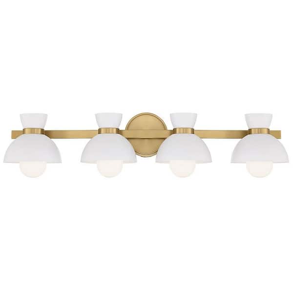 33.5 in. 4-Light Natural Brass Vanity Light with White Metal Shades