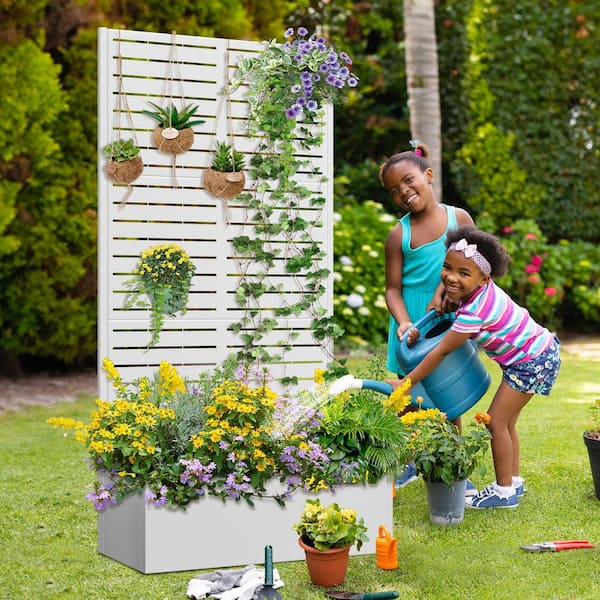 71 in. x 35 in. x 16 in. Raised Garden Bed w/Trellis, Metal Planter Box w/Trellis, Outdoor Planter Box, White-Louvered