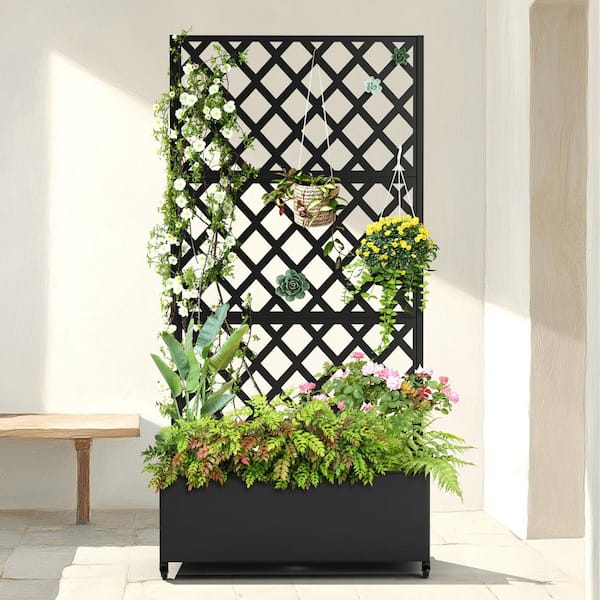 73 in. x 35 in. Raised Garden Bed with Trellis, Metal Planter Box Drainage Holes, Outdoor Planter Box on Wheels, Black