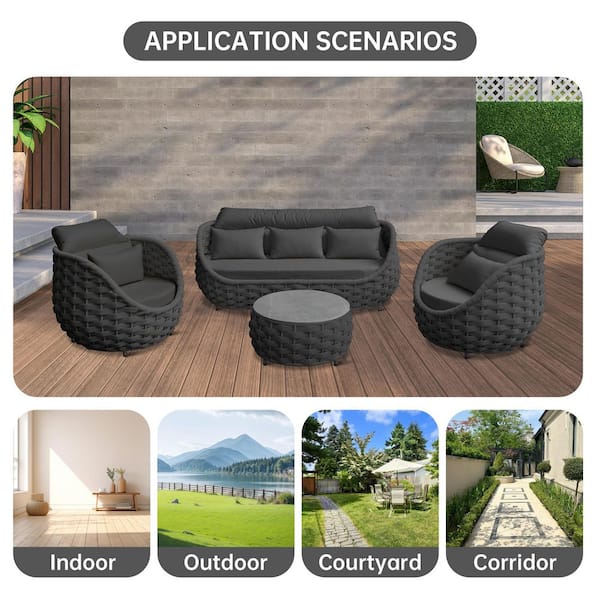 4-Piece Black Aluminum Polyester Woven Rope Outdoor Sectional Set 3-Seater Sofa with Dark Grey Cushions