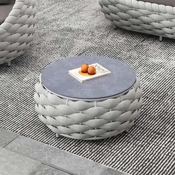 Gray Round Aluminum Patio Outdoor Coffee Table with Rock Slabs