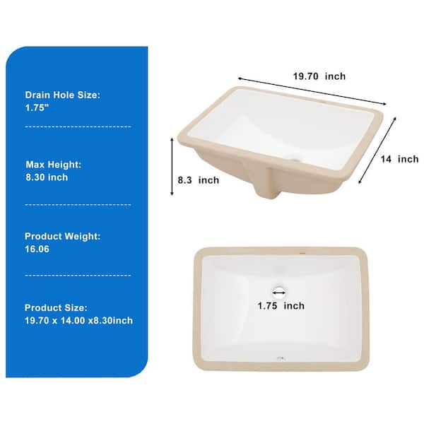 19.7 in. x 14 in. White Ceramic Rectangular Undermount Bathroom Sink with Overflow