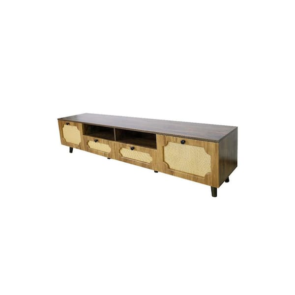 Brown TV Cabinet with Solid Wood Legs Fits 65 in. TV, has UV-Open Drawers and Rattan Design For Living/Bedroom