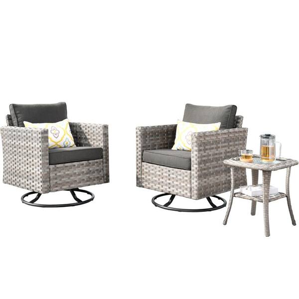 Tahoe Grey 3-Piece Wicker Outdoor Patio Conversation Swivel Rocking Chair Set with a Side Table and Black Cushions