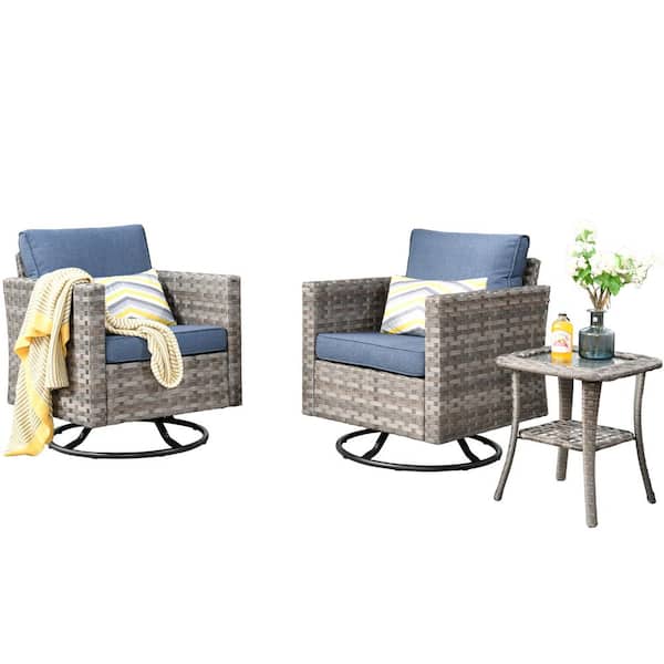 Tahoe Grey 3-Piece Wicker Outdoor Patio Conversation Swivel Rocking Chair Set with a Side Table and Denim Blue Cushions