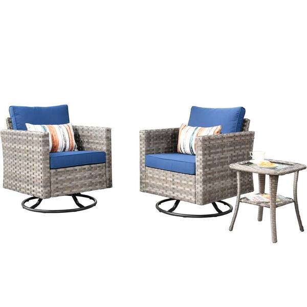 Tahoe Grey 3-Piece Wicker Outdoor Patio Conversation Swivel Rocking Chair Set with a Side Table and Navy Blue Cushions