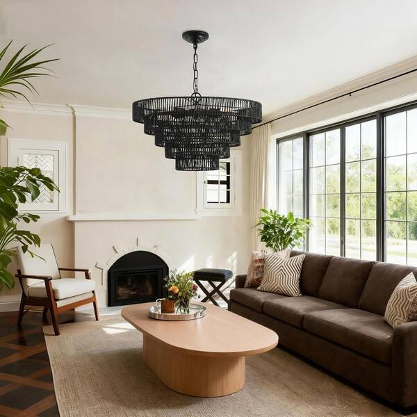 Vitra 24 in. 8-Light E12 Black Iron Hemp Rope 5-Tier Boho Pendant Chandelier