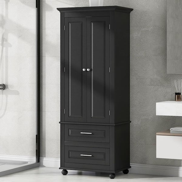 24 in. W x 15.7 in. D x 62.5 in. H Black Wood Freestanding Tall Linen Cabinet with Adjustable Shelf and Drawers
