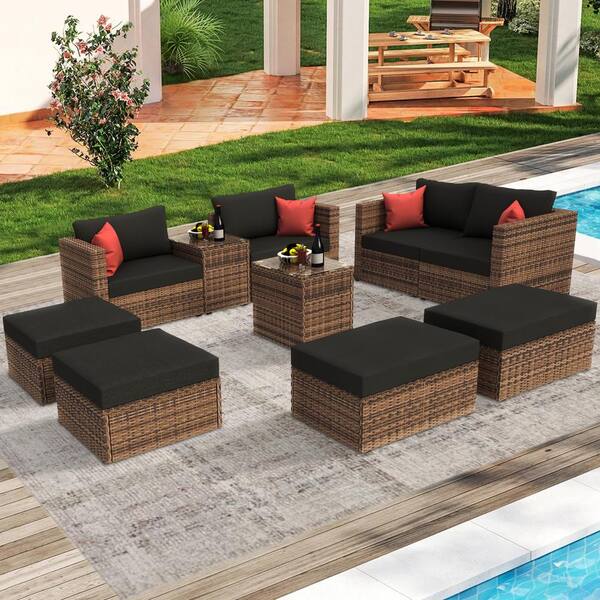 10-Piece Wicker Outdoor Furniture Set Patio Sectional Conversation Sofa Set with Black Cushions and Red Pillows