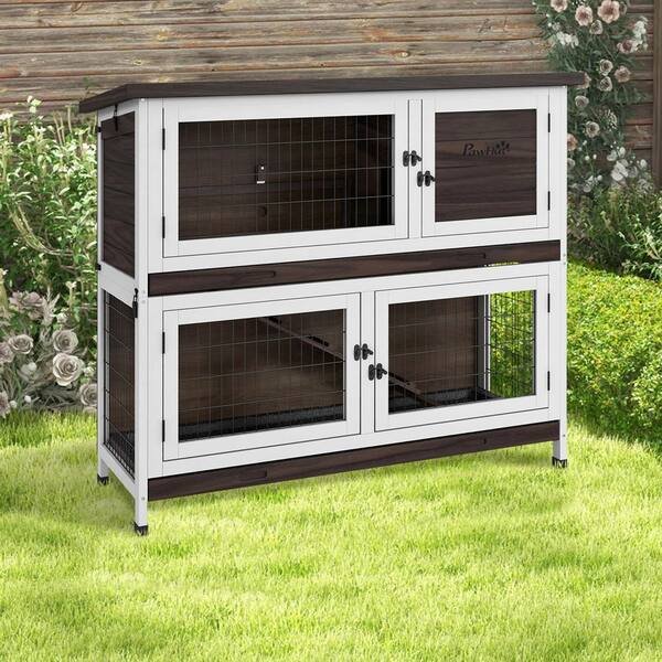 2-Tier Outdoor Wooden Rabbit Cage Guinea Pig Cage Small Animal Hutch with Double Removable Trays, Ramp, Asphalt Roof