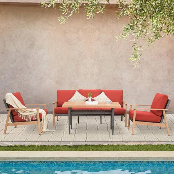 4-Piece Aluminum Rattan Patio Conversation Sets Outdoor Furniture Sectional Set with Red Cushions and 2 Pillows
