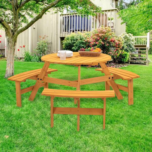 6-Person Circular Outdoor Wooden Picnic Table with 3 Built-in Benches, 1720 lbs. Capacity, Natural