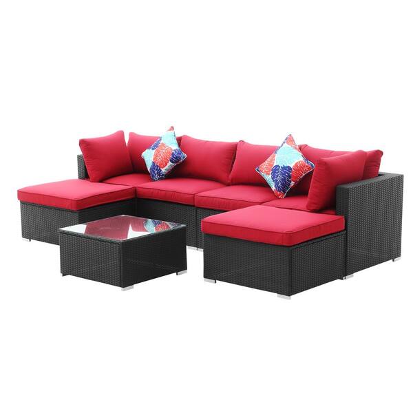 7-Piece Rattan Wicker Steel Patio Furniture Set Outdoor Sectional Conversation Set with Red Cushions Soft Gray