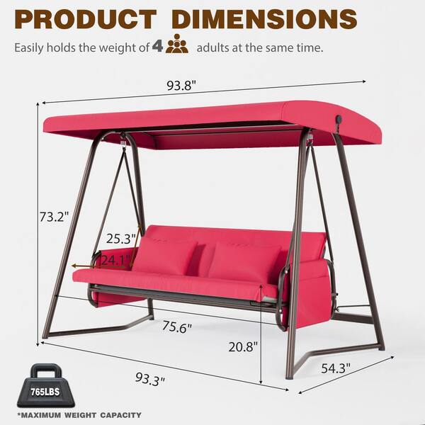 Outdoor Patio 3 Seaters Metal Swing Chair, Swing Bed with Cushion and Adjustable Canopy, Red