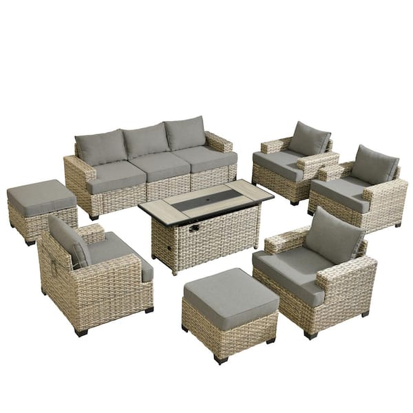Taylor 10-Piece Wicker Patio Rectangular Fire Pit Set with Dark Gray Cushions
