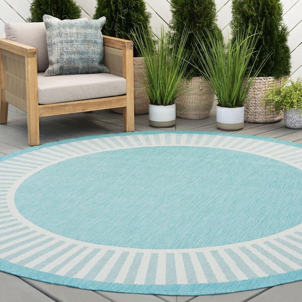 Eco Striped Border Aqua 8 ft. Round Indoor/Outdoor Area Rug