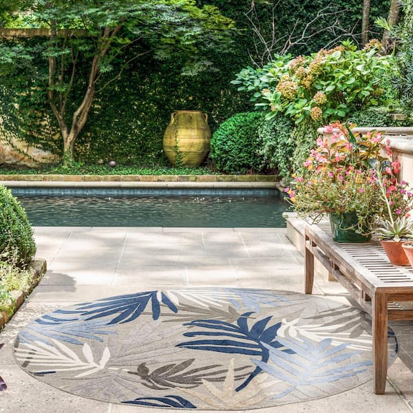 Oasis Floral Blue 8 ft. Round Indoor/Outdoor Area Rug