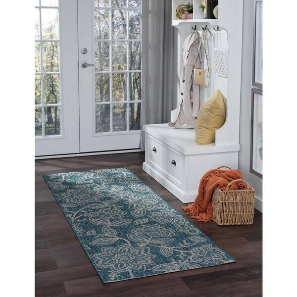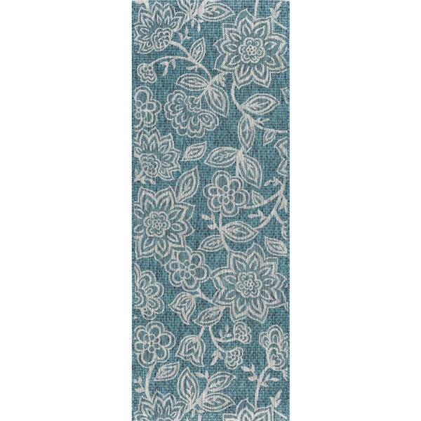 Veranda Floral Aqua 3 ft. x 8 ft. Indoor/Outdoor Runner Rug