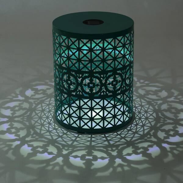 Teal Color Round Metal Outdoor Side Table with Solar Powered Light for Garden Backyard Patio