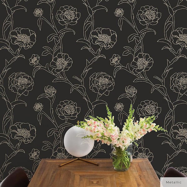 Black and Metallic Gold Peonies Vinyl Peel and Stick Wallpaper Roll (Covers 28 sq. ft.)