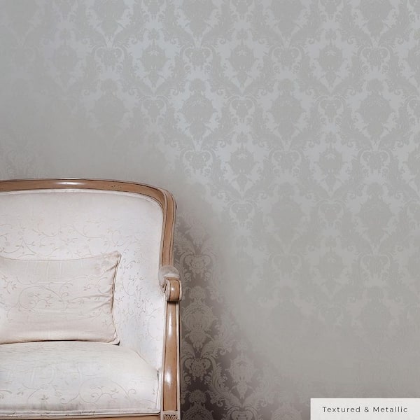 • Sleek metallic silver damask wallpaper brings old-world beauty