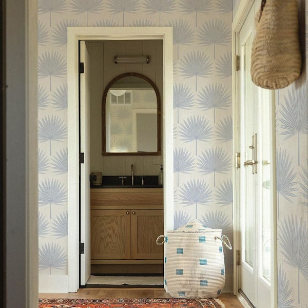 Powder Blue and Off-White Stamped Palm Vinyl Peel and Stick Wallpaper Roll (Covers 56 sq. ft. )