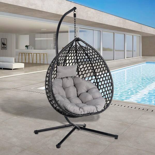 1-Person Wicker Versatile Hanging Egg Chair Patio Swing with Gray Cushions and Adjustable Headrest
