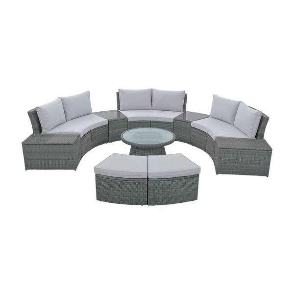 10-Piece Wicker Half Round Patio Conversation Set with Light Gray Cushions
