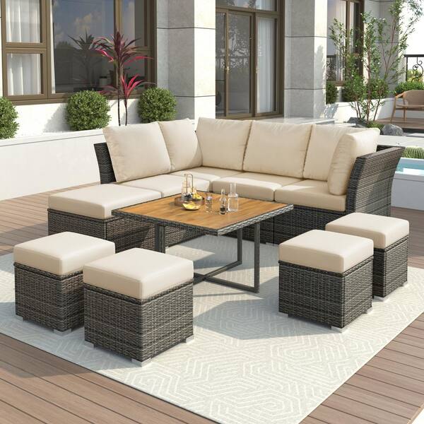 10-Piece Wicker Patio Conversation Set with Beige Cushions Solid Wood Coffee Table Ottomans