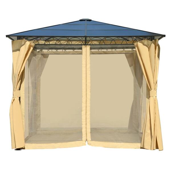 10 ft. x 10 ft. Hardtop Outdoor Beige Gazebo with Polycarbonate Roof Aluminum Frame and Mosquito Netting