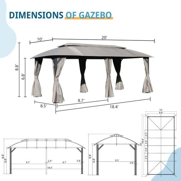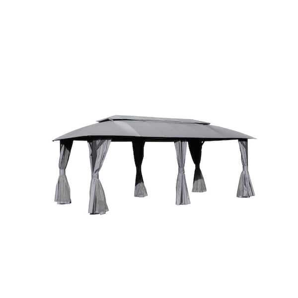 10 ft. x 20 ft. Gray Outdoor Gazebo with Double Roofs, Privacy Curtains, Mosquito Nettings, Heavy Duty Metal Frame