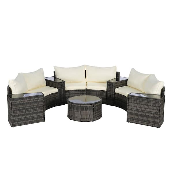 11-Piece Wicker Patio Conversation Set with Beige Cushions, Tempered Glass Round Coffee Table