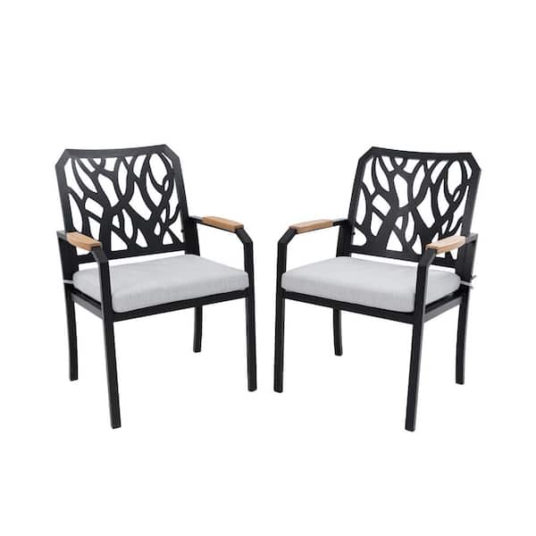 2-Piece Black Metal Outdoor Lounge Chair with White Cushions, Wood Armrests