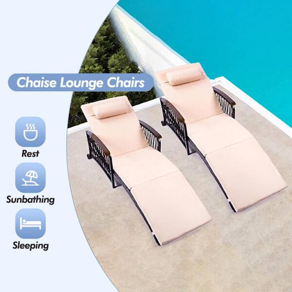 2-Piece Wicker Outdoor Recliner Patio Chaise Lounge with Khaki Cushions, 5-Position Backrest, Wheels
