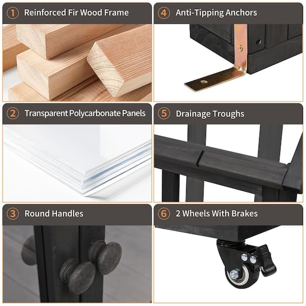 23.6 in. W x 47.2 in. D x 69.3 in. H Black Wood Portable Frame Movable Wheels Greenhouse Openable Roof and Storage Box