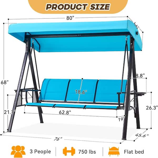 3-Person Metal Patio Swing with Textilene Backrest & 2 Cup Holders, Lake Blue Adjustable Canopy