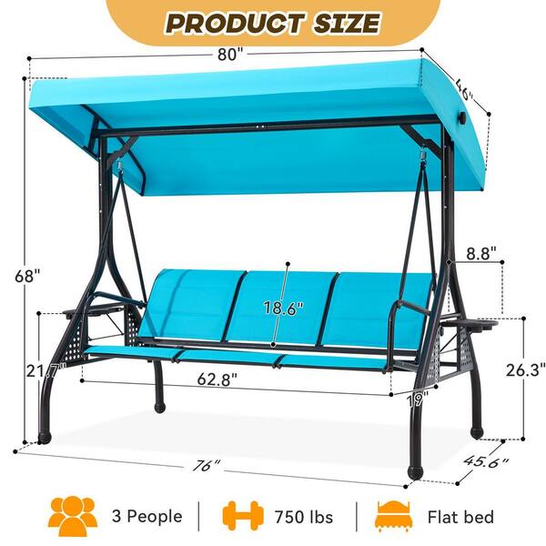 3-Person Round Tube Metal Patio Swing with Textilene Backrest & 2 Cup Holders, Lake Blue Adjustable Canopy