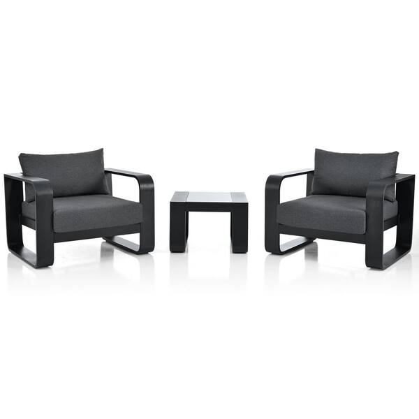 3-Piece Black All Weather Metal Patio Conversation Set with Gray Cushions, Coffee Table