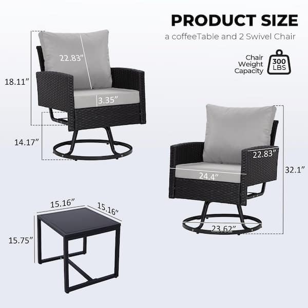 3-Piece Black Wicker Outdoor Bistro Set Patio Seating Set with Gray Cushions, 2 Swivel Chairs and 1 Coffee Table
