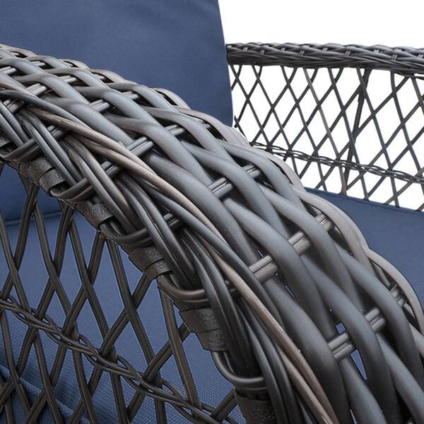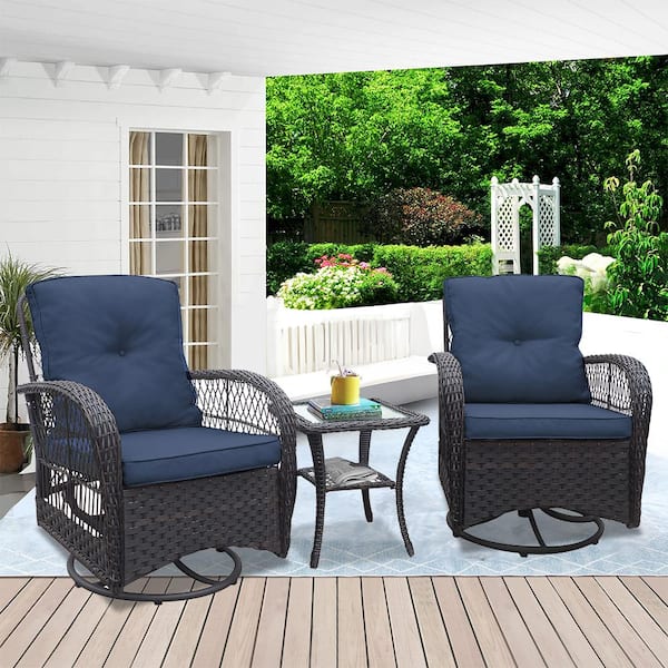3-Piece Brown Wicker Patio Conversation Set with Navy Blue Cushions, Glass Top Side Table