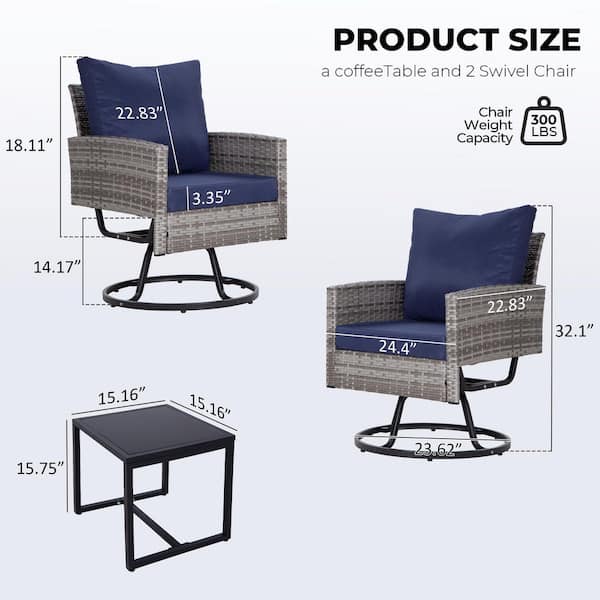 3-Piece Gray Wicker Outdoor Bistro Set Patio Seating Set with Blue Cushions, 2 Swivel Chairs and 1 Coffee Table