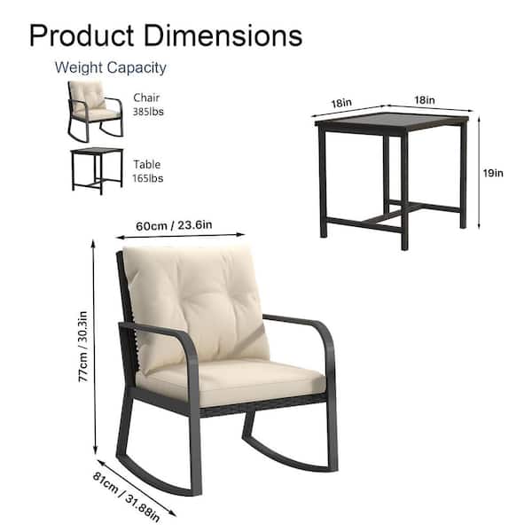 3-Piece Metal Wicker Outdoor Bistro Set Rocking Chair Set with Beige Cushions, 2 Rocking Chairs, Glass-Top Table