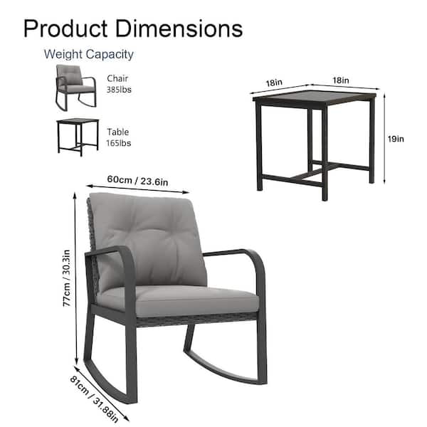 3-Piece Metal Wicker Outdoor Bistro Set Rocking Chair Set with Gray Cushions, 2 Rocking Chairs, Glass-Top Table