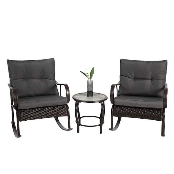 3-Piece Wicker Patio Conversation Set Sofa Set Rocking Chair Set with Table and Gray Cushions