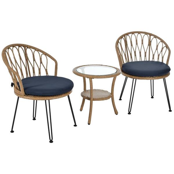 3-Piece Yellow Wicker Patio Conversation Seating Set with Blue Cushions