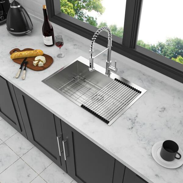 33 in. Drop-in Single Bowl 18-Gauge Brushed Nickel Stainless Steel Kitchen Sink with Bottom Grids, Drying Rack