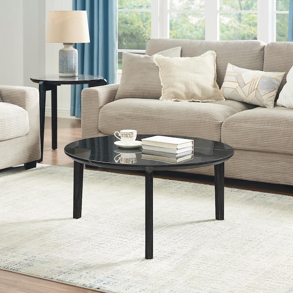 36 in. Black Solid Wood Round Outdoor Coffee Table with Imitation Marble Tabletop