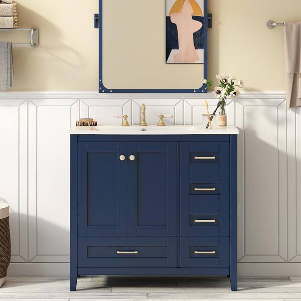 36 in. W Single Sink Freestanding Bath Vanity in Blue with White Resin Top and 4-Drawers