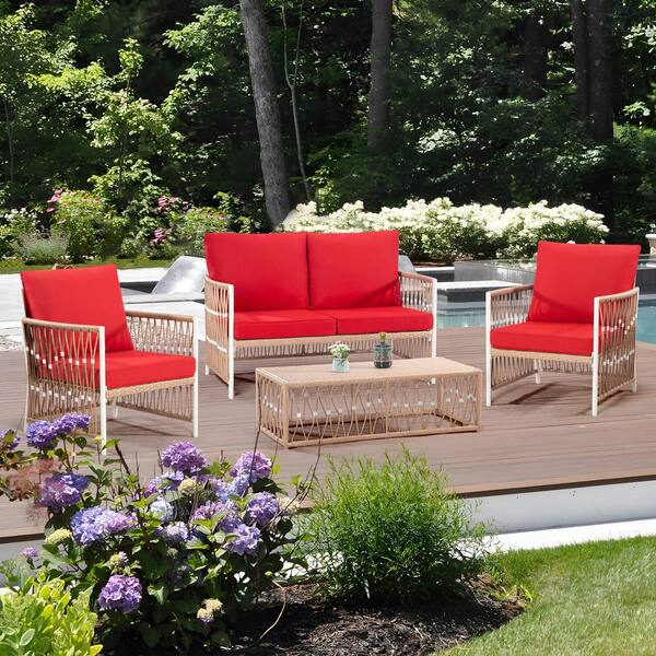4--Piece Brown Wicker Patio Conversation Set with Red Cushions, 2 Chairs, 1 Loveseat and 1 Coffee Table